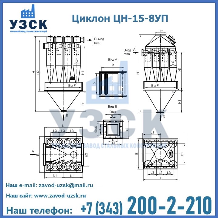 Завод «УЗСК» в Рудный предлагает большой выбор циклонов ЦН-15-500×8УП и прочих устройств, полностью укомплектованных и готовых к эксплуатации. Мы гарантируем соответствие оборудования всем требованиям ГОСТ и ТУ, износостойкость и высокую производительность предлагаемого оборудования. Уральский Завод Стальных Конструкций изготавливает и продает надежное, эффективное и производительное оборудование, имеющее длительную гарантию и большой эксплуатационный ресурс. Если требуется изготовить циклон нестандартных размеров, то такой вариант выполнения заказа тоже предусмотрен, так как предприятие имеет собственные производственные площади и надежных поставщиков. На все поставляемое или производимое оборудование имеются чертежи и прочая техническая документация. Заказать и купить циклоны или прочее оборудование высокого качества и по доступной цене можно через наш сайт или по указанному в разделе «Контакты» телефону.