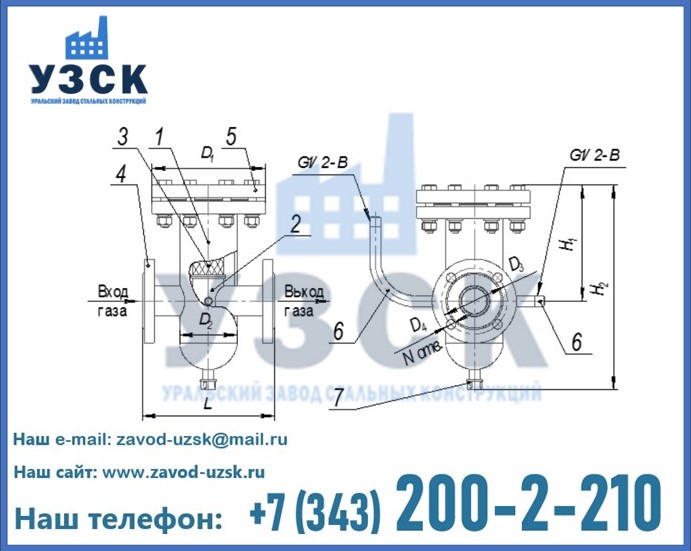 Когда газ проходит через ФГ, часть механических примесей оседает на непосредственно фильтрующем элементе (№3 на схеме). Остальная часть примесей и конденсат оседают внизу корпуса. Для определения степени загрязнения фильтра, необходимо свериться с показаниями измерительного прибора, который присоединен к штуцерам (№6 на схеме).