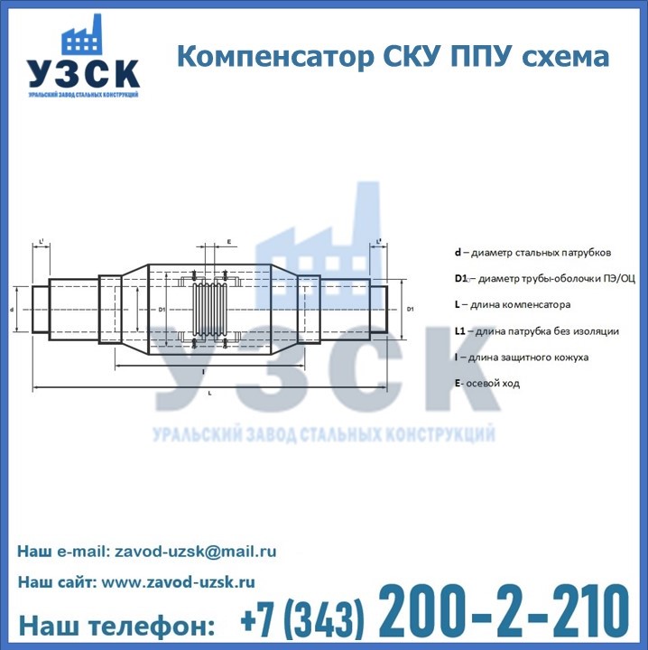Уральский Завод Стальных Конструкций в Рудный предлагает готовые изделия, а также вы можете приобрести компенсатор СКУ ППУ под заказ. Наш завод располагает всем необходимым оборудованием для производства нестандартных позиций компенсатора СКУ в ППУ изоляции. Завод «УЗСК» предлагает большой выбор качественных и надежных компенсаторов СКУ ППУ, полностью укомплектованных и готовых к эксплуатации. Мы гарантируем соответствие нашей продукции всем требованиям ГОСТ и ТУ, износостойкость и высокую производительность. Наше предприятие поставляет и производит оборудование, имеющее длительную гарантию и большой эксплуатационный ресурс. Если вы хотите заказать сильфонные компенсационные устройства СКУ ППУ или другое оборудование с доставкой, наши специалисты помогут рассчитать стоимость транспортных расходов и организуют доставку товара. Вы можете оформить заказ на продукцию на нашем сайте, для этого достаточно заполнить форму обратной связи.